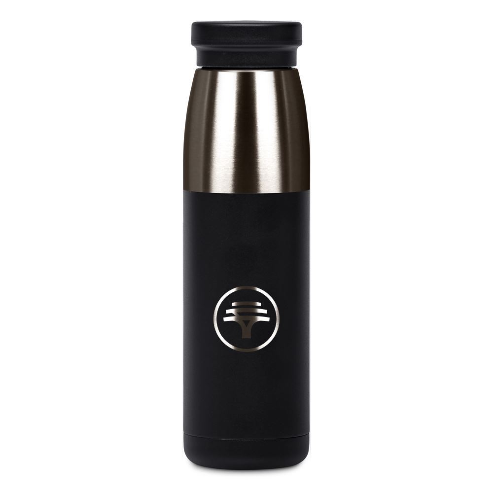 A strikingly elegant vacuum water bottle which will keep your liquids hot or cold for hours. Combination finish of powder coated black and shiny gun metal.
