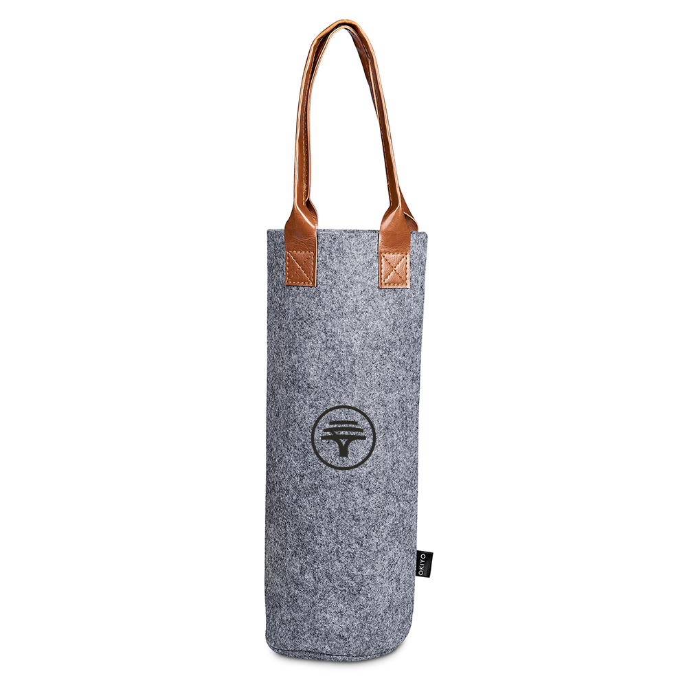 Elevate your gifting or presentation with the Okiyo Tahada Wine Tote — a sustainable and stylish way to carry or package a bottle of wine or champagne. Made from RPET felt crafted using recycled plastic bottles, it’s both eco-conscious and functional. The light brown PU handles add a refined contrast and provide a secure grip.