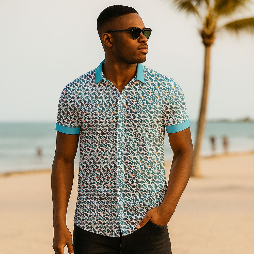 Fully dye sublimated short sleeve button down lounge shirts with contrast fused collar and cuff sleeve ends.