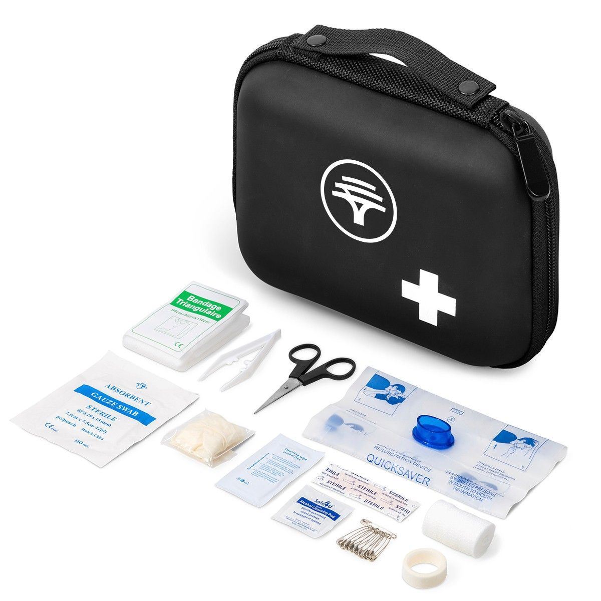 A compact and handy first aid kit. Hard shell case: 17 ( l ) x 13.5 ( w ) x 5.5 ( h ) PU and EVA 1 x PBT bandages 1 x scissor 2 x swabs 1 x tape 1 x triangle bandage 6 x safety pins 4 x alcohol pads 2 x cleansing wipes 6 x plasters 2 x disposable vinyl gloves 1 x plastic tweezer 1 x CPR face shield EN13485 compliant.